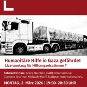 2. März 2026 Mo., 19:00 Uhr | Humanitäre Hilfe in Gaza gefährdet Israelische Regierung kündet Lizenzentzug für Hilfsorganisationen an Haus der Evangelischen Kirche Bonn |  |