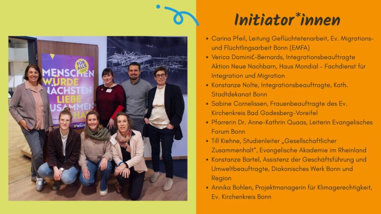 Eine Kooperation von: Evangelische Migrations- und Flüchtlingsarbeit Bonn EMFA • Haus Mondial (Caritas) • Frauenbeauftragte des Ev. Kirchenkreises Bad Godesberg-Voreifel • Kath. Stadtdekanat Bonn und Aktion Neue Nachbarn • Evangelisches Forum Bonn • Diakonisches Werk Bonn und Region • Katholisches Bildungsforum Bonn • Evangelische Akademie im Rheinland • Ev. Kirchenkreis Bonn