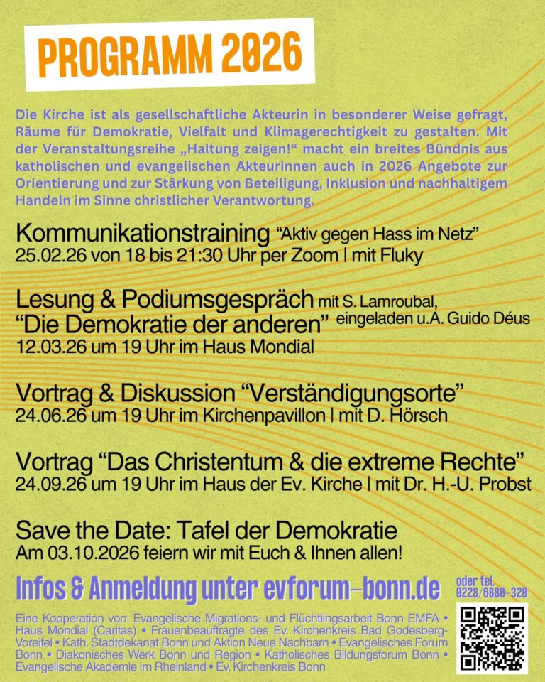 Mit der Veranstaltungsreihe „Haltung zeigen!“ macht ein breites Bündnis aus katholischen und evangelischen Akteur:innen auch in 2026 Angebote zur Orientierung und zur Stärkung von Beteiligung, Inklusion und nachhaltigem Handeln im Sinne christlicher Verantwortung.