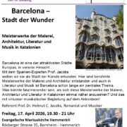 | 17. April 2026 Fr., 19:30 Uhr | Zeit für Bildung – „Barcelona • Stadt der Wunder“ Meisterwerke der Malerei, Architektur, Literatur und Musik in Katalonien Evangelische Markuskirche Hemmerich | Eintritt: kostenfrei | Kurs-Nr.: Vor-zeit | ![]() |