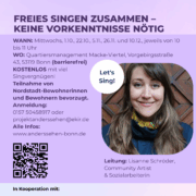 | 1. Oktober 2025 Mi., 10:00 Uhr | Alle Stimmen – Musik für Alle! Freies Singen mit Lisanne Quartiersmanagement Macke-Viertel | Eintritt: kostenfrei | Kurs-Nr.: EMFA-VA | ![]() |