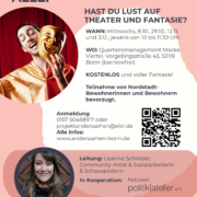 | 8. Oktober 2025 Mi., 10:00 Uhr | Theater für alle! Ein kreatives Angebot voller Fantasie Quartiersmanagement Macke-Viertel | Eintritt: kostenfrei | Kurs-Nr.: EMFA-VA | ![]() |