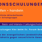 | 23. April 2026 Do., 14:00 Uhr | Präventionsschulung Intensiv/ Leitungsschulung • Teil 1_Präsenz Für haupt- und ehrenamtlich Mitarbeitende mit Leitungsverantwortung oder Kontakt zur Schutzgruppe Haus der Evangelischen Kirche Bonn | Eintritt: 100 € Teilnahmegebühr pro Person | Kurs-Nr.: Präv-INT 23/ 24-04-26 | ![]() |