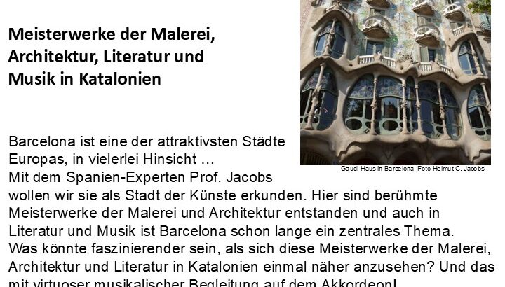 Mit dem Spanien-Experten Prof. Jacobs wollen wir sie als Stadt der Künste erkunden. Hier sind berühmte Meisterwerke der Malerei und Architektur entstanden und auch in Literatur und Musik ist Barcelona schon lange ein zentrales Thema. Was könnte faszinierender sein, als sich diese Meisterwerke der Malerei, Architektur und Literatur in Katalonien einmal näher anzusehen? Und das mit virtuoser musikalischer Begleitung auf dem Akkordeon!