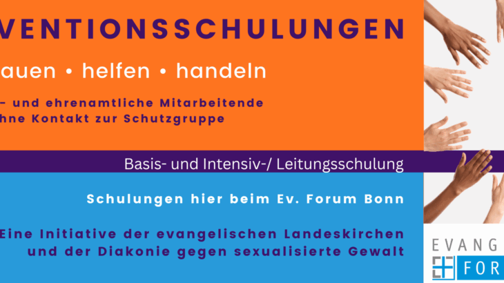 Unsere Schulungen zur Prävention von sexualisierter Gewalt richten sich an alle haupt- und ehrenamtlich Mitarbeitenden im kirchlichen Kontext. Sie sind verpflichtender Bestandteil des Schutzkonzepts der Evangelischen Kirchenkreise Bonn sowie An Sieg und Rhein.