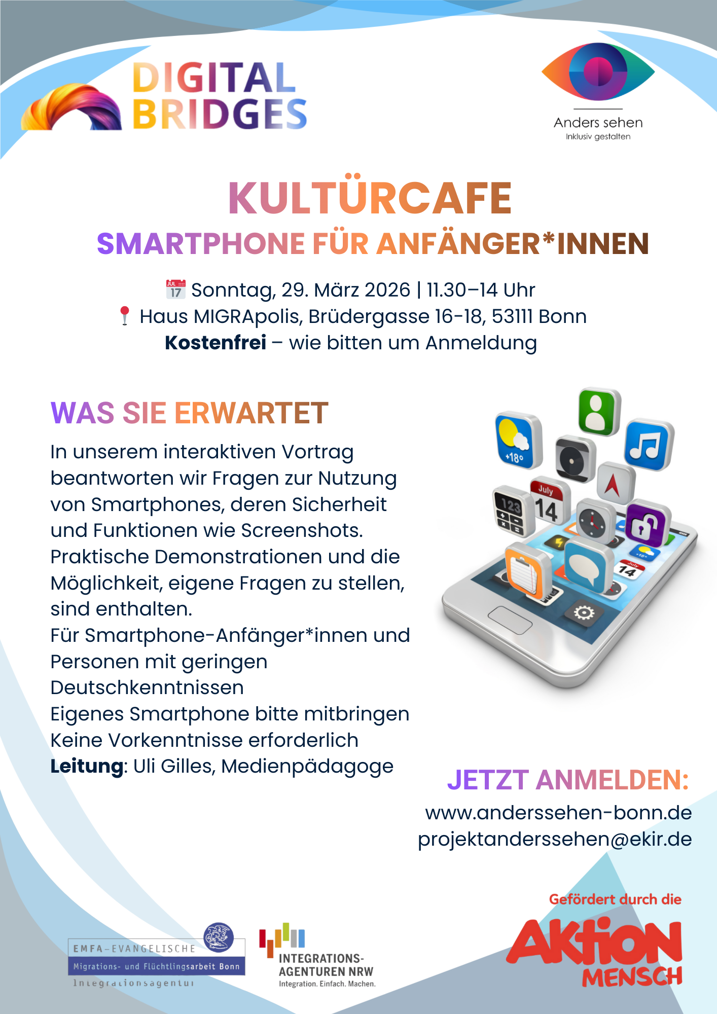Interaktiver Vortrag zu grundlegenden Smartphone-Funktionen, Sicherheit und praktischer Nutzung. Für Anfänger*innen, keine Vorkenntnisse nötig. Eigenes Smartphone bitte mitbringen. So., 29.3.2026 | 11:30–14 Uhr Haus MIGRApolis, Brüdergasse 16–18, 53111 Bonn Kostenfrei | Anmeldung erforderlich Leitung: Uli Gilles Anmeldung: www.anderssehen-bonn.de | projektanderssehen@ekir.de Projekt "Anders sehen - inklusiv gestalten. Begegnung und Kultur in Vielfalt" Evangelische Migrations- und Flüchtlingsarbeit Weiterlesen