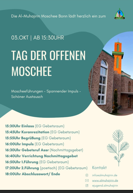 Die Al-Muhajirin Moschee Bonn lädt herzlich ein zum Tag der offenen Moschee am Freitag, 3. Oktober 2025. Besucherinnen und Besucher erhalten die Möglichkeit, Einblicke in das Gemeindeleben zu gewinnen, eine Moscheeführung mitzuerleben und miteinander ins Gespräch zu kommen. Das Programm beginnt um 15:30 Uhr mit Einlass und einer Koranrezitation. Nach der Begrüßung folgt ein spannender Weiterlesen