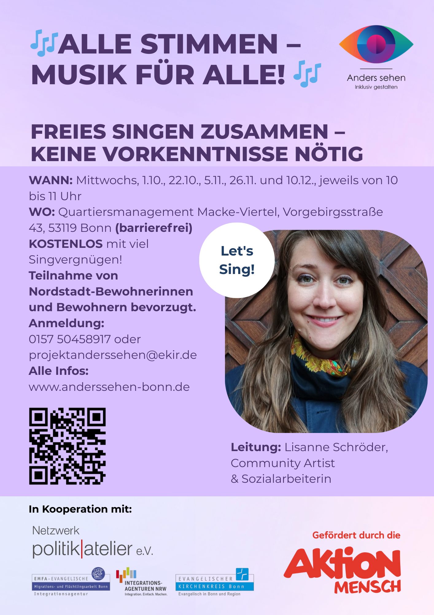 Einfach vorbeikommen, mitsingen und Freude an der Musik teilen! Gemeinsam mit Lisanne Schröder, Community Artist & Sozialarbeiterin, laden wir alle Interessierten zum freien Singen ein – ohne Vorkenntnisse und mit viel Spaß am gemeinsamen Klang. Die Teilnahme ist kostenlos. Nordstadt-Bewohner*innen werden bevorzugt. Termine - jeweils 10 - 11 Uhr Mittwoch, 10. Dezember 2025 Ort:Quartiersmanagement Macke-Viertel, Vorgebirgsstraße Weiterlesen