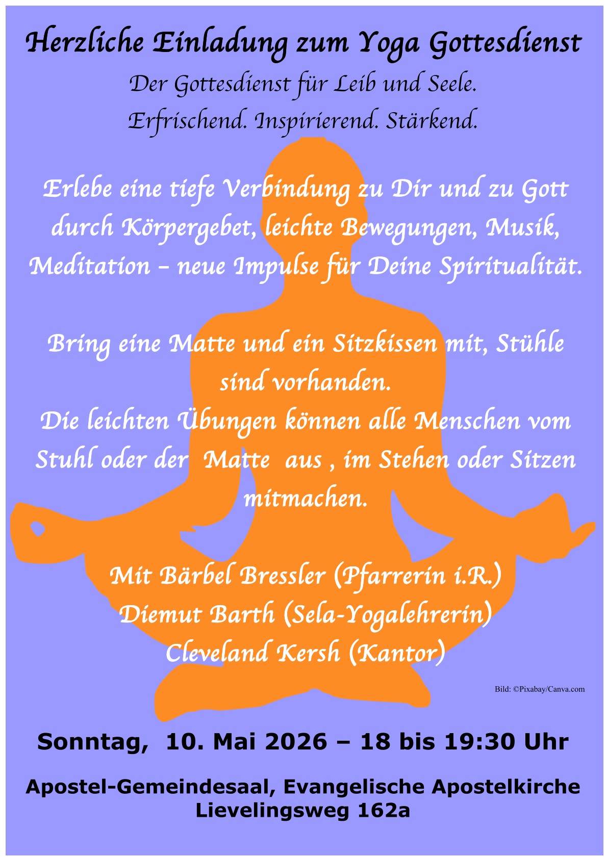 Mit ▶️ Bärbel Bressler (Pfarrerin i.R.) • Diemut Barth (Sela-Yogalehrerin) • Cleveland Kersh (Kantor)