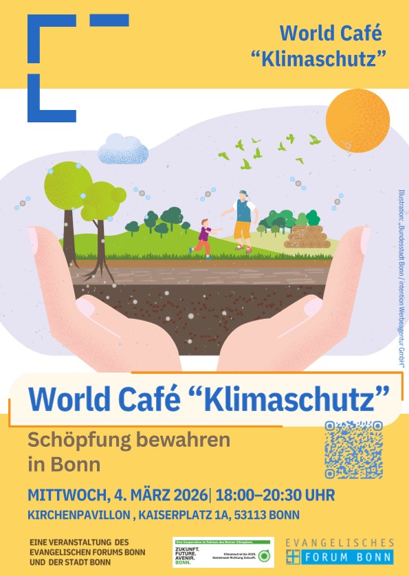 Achtung - die Veranstaltung wurde abgesagt!_stand 02.03.26 Stadt Bonn 📍 Zu Beginn der Veranstaltung erkunden die Teilnehmenden gemeinsam in der Kreuzkirche die interaktive Ausstellung zum Bonner Klimaplan 2035. Im Anschluss findet im Kirchenpavillon ein 🌍 World Café statt. In kleinen moderierten Gesprächsrunden und an vier Thementischen tauschen sich die Teilnehmenden zu zentralen Fragen des Klimaschutzes aus. Weiterlesen